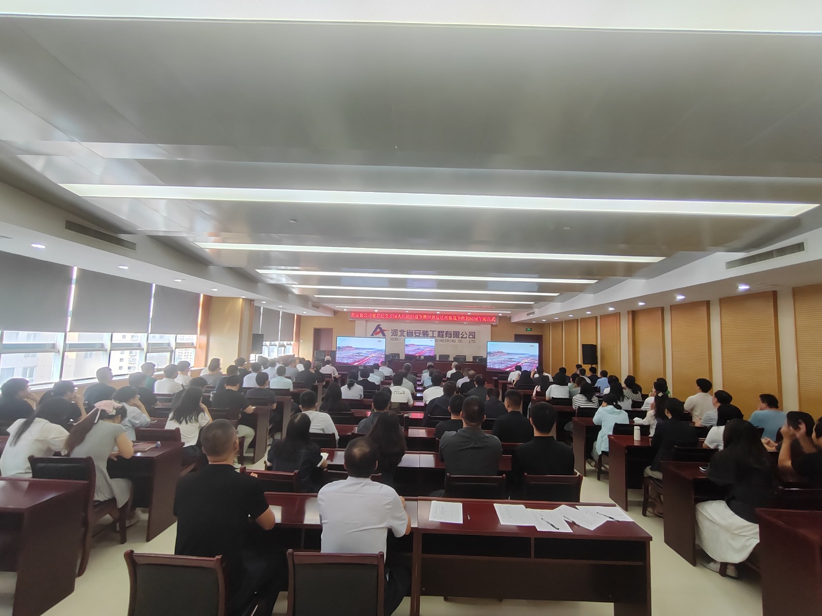 2025年9月3日,為紀(jì)念中國(guó)人民抗日戰(zhàn)爭(zhēng)暨世界反法西斯戰(zhàn)爭(zhēng)勝利80周年,河北省安裝工程有限公司積極組織職工集中觀看閱兵盛況直播。公司機(jī)關(guān)及各分公司、項(xiàng)目部共計(jì)2000余人通過(guò)多種方式同步參與,共同回顧歷史、緬懷先烈、展望未來(lái)。上午9時(shí),習(xí)近平總書記發(fā)表重要講話,9時(shí)19分大閱兵正式開(kāi)始,公司機(jī)關(guān)及各分公司、項(xiàng)目部會(huì)議室座無(wú)虛席,職工們們整齊地坐在屏幕前,神情莊重地注視著電視畫面。在閱兵式過(guò)程中,